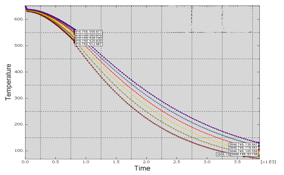 项目包含:ERW生产线专用管焊接后钢管的冷却模拟、热张减后钢管在冷床上的整体冷却模拟以及热处理后钢管在冷床上的整体冷却模拟。通过对这些冷却过程进行有限元模拟计算研究,可得出各个冷却过程中焊缝或钢管的冷却曲线。通过对冷却曲线的研究,可验证冷床的尺寸是否满足工艺要求,同时可以在生产工艺的制订