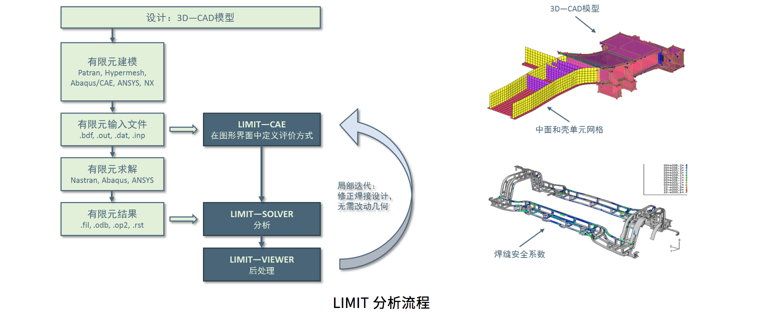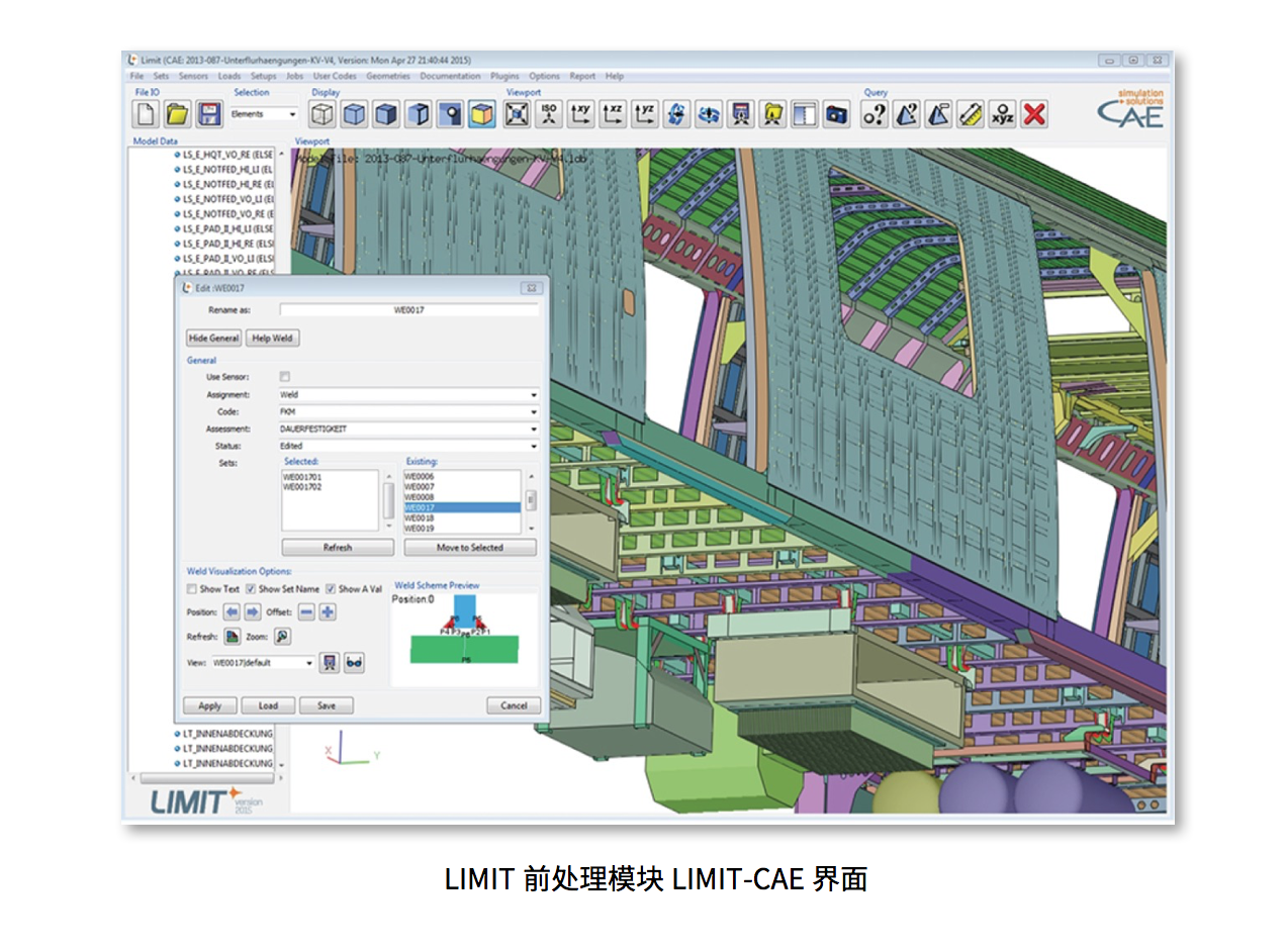 LIMIT-CAE是LIMIT软件的前后处理模块,也是建模,分析和仿真的人机交互平台。使用者在该模块中可以进行模型读入,模型查看,模型编辑,自动焊缝识别,评价标准选择和设置、自动报告生成、运行用户脚本等功能。该模块可以进一步将生成的模型投入到后台的LIMIT-SOLVER求解模块运行,对运行情况进行监测。