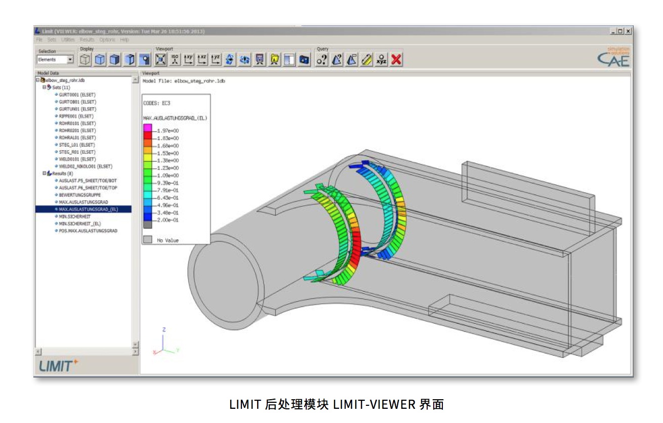 LIMIT-VIEWER的后处理支持LIMIT分析模块的所有功能,对计算结果的描述和解释提供了范围很广的选择,可根据选用的评价标准显示利用度、安全系数、寿命等信息。除了通常的云图,还可进行数据提取、最大数值标注等。