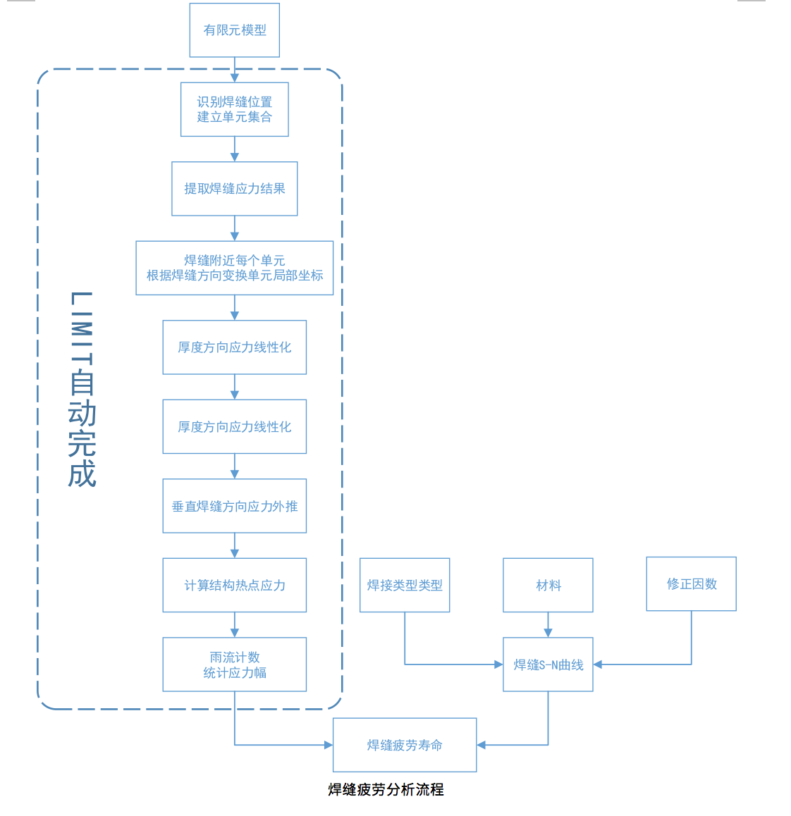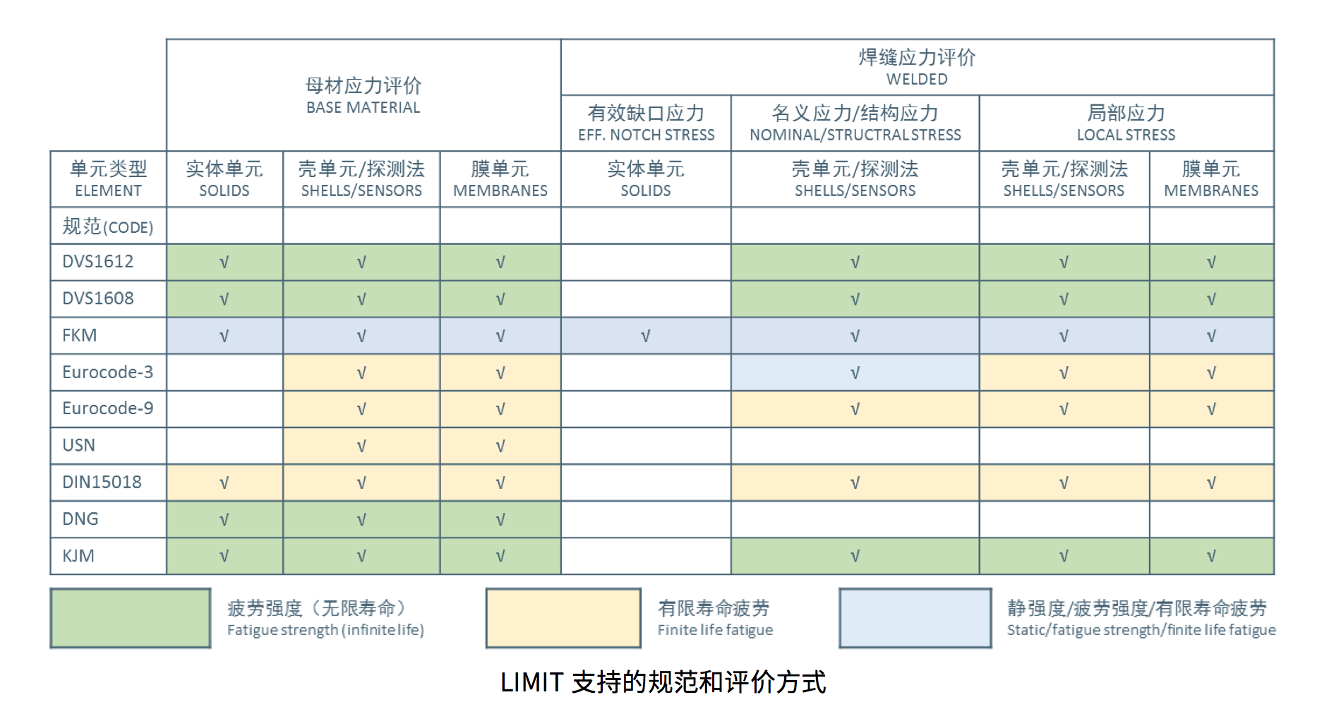 欧洲钢结构设计规范EN 1993-1-9 (Eurocode 3)是在分析大量的试验结果的基础上给出了评估承受动载荷的构件及接头的貌疲劳设计方法。规范给出了80种钢结构(碳钢、碳猛钢和细晶粒钢)焊接接头的数据,以及57种锅合金辉接接头的S-N曲线的数据。规范模块支持使用名义应力、结构热点应力和缺口应力评价方法。这些方法考虑了结构的几何尺寸、生产和制造引起的缺陷及接头的细节特征对结构抗疲劳性能的影响。规范对母材及焊缝的疲劳设计方法进行了分类说明。对于焊缝,按照规范要求评估垂直于焊缝轴线的组合正应力及沿焊缝轴线的剪应力。LIMIT包含规范里面规定的全部焊接接头形式的名义应力和结构热点应力评价方式、材料数据库以及各项修正因数。